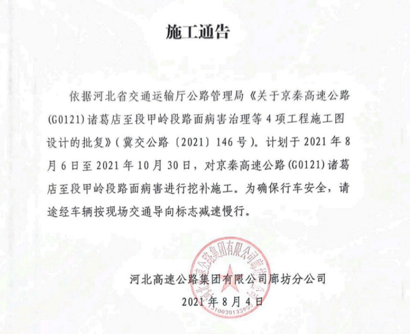 依据河北省交通运输厅公路管理局《关于京秦高速公路(G0121)诸葛店至段甲岭段路面病害治理等4项工程施工图设计的批复》(冀交公路〔2021〕146号)。计划于2021年8月6日至2021年10月30日,对京秦高速公路(G0121)诸葛店至段甲岭段路面病害进行挖补施工。为确保行车安全,请途经车辆按现场交通导向标志减速慢行。