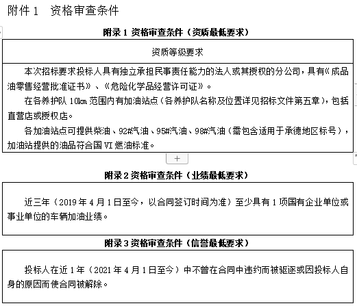3.1本次招标要求投标人具有独立承担民事责任能力的法人或其授权的分公司,具有《成品油零售经营批准证书》、《危险化学品经营许可证》。近三年(2019年4月1日至今,以合同签订时间为准)至少具有1项国有企业单位或事业单位的车辆加油业绩。