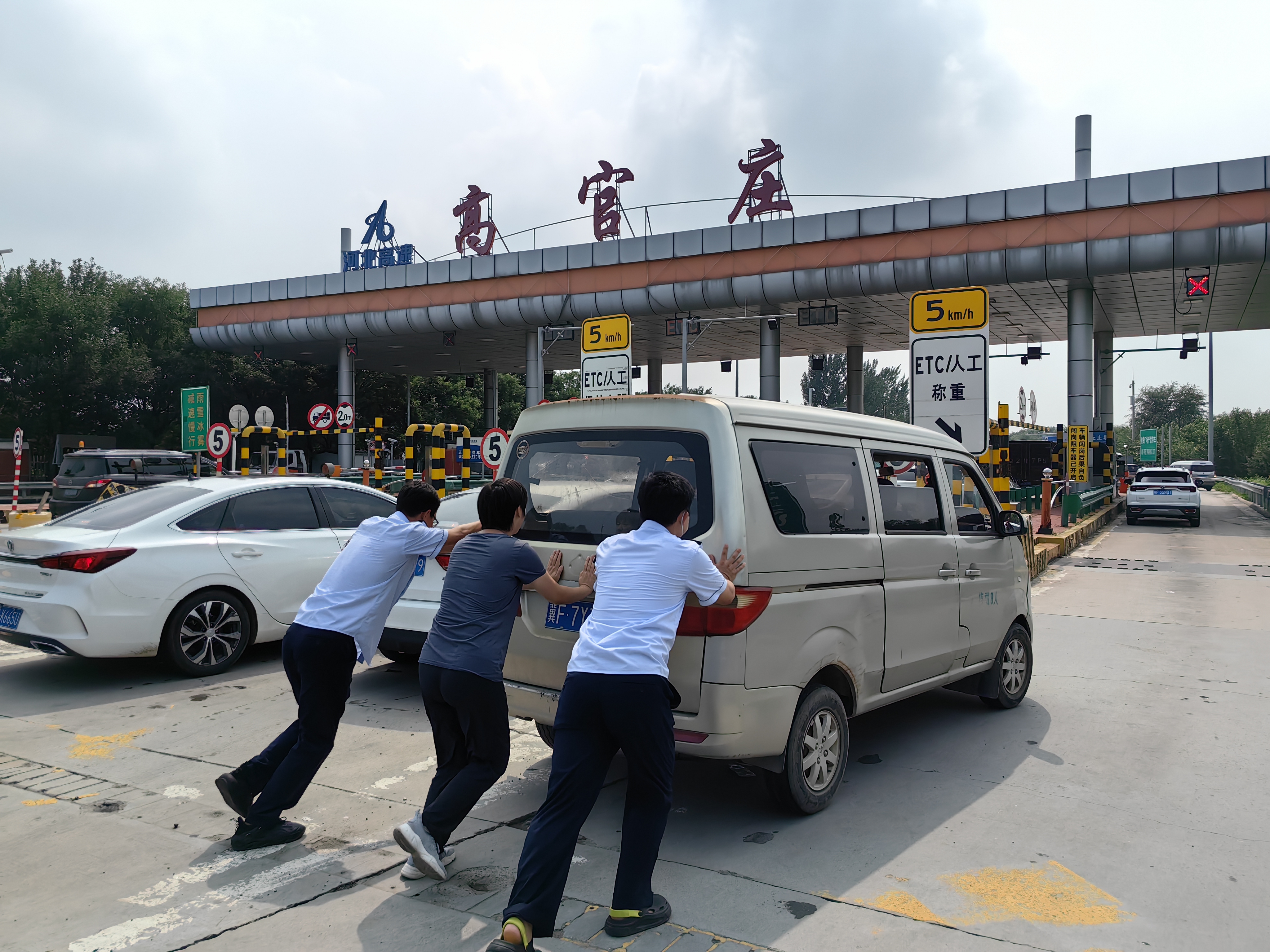 受持续暴雨影响,高官庄收费站计重设备故障,站领导班子组织在岗党员成立防汛保畅先锋队,积极配合收费一线完成过往车辆疏导工作。(摄影:王芳 郑亚敬)