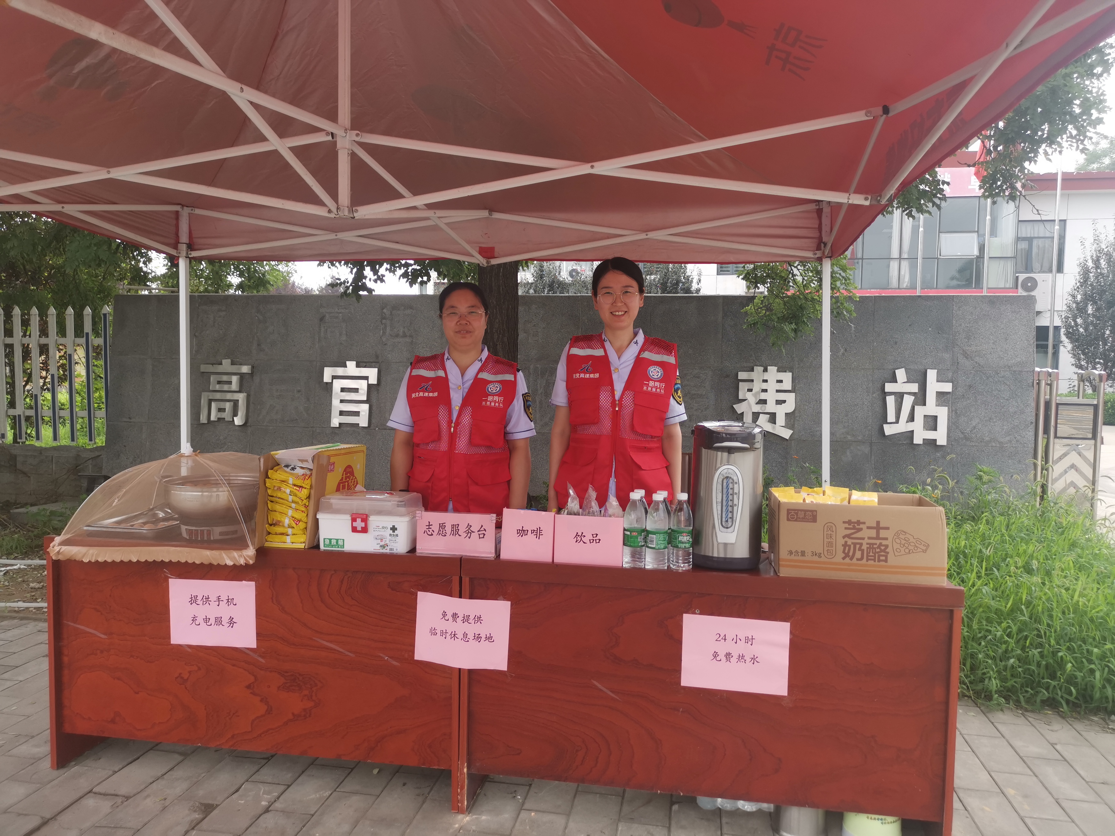 高官庄收费站组建了“一路同行”志愿服务队,在收费站入口位置设立服务台,为返程救援人员免费提供食物、矿泉水和应急药品。(摄影:王芳 郑亚敬)
