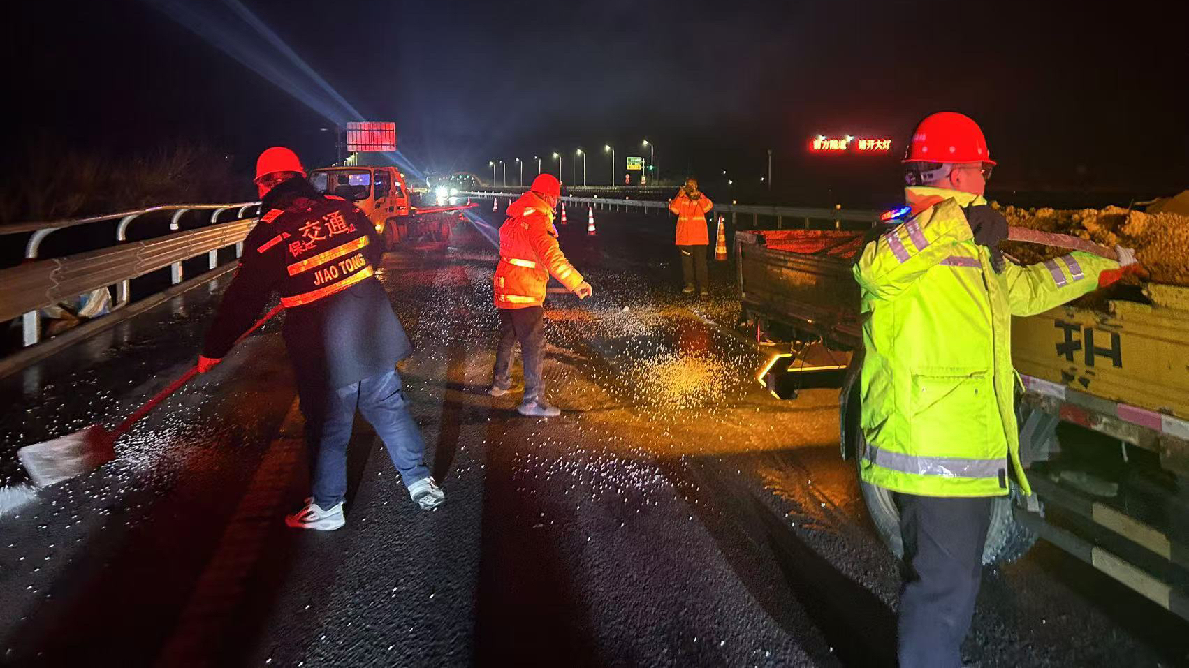 然而,灭火后的难题接踵而至。大量的消防用水在低温下迅速结冰,给过往车辆带来了极大的安全隐患。为此,分公司立刻调配京哈北养护作业队装载融雪剂,对重点结冰区域进行人工撒布和铲除;同时安排救援公司清障车辆和工作人员迅速清理现场,很快就实现了所有车道的安全畅通。