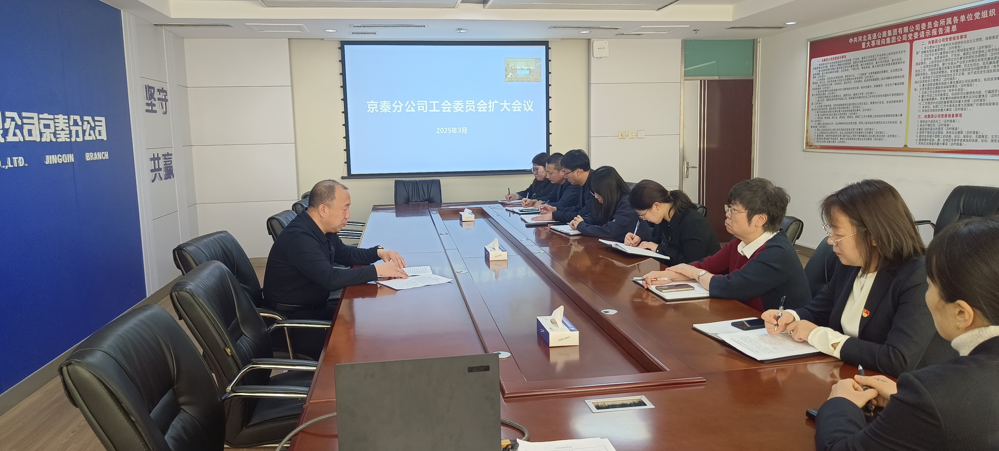 3月19日,京秦分公司工会召开工会委员会扩大会议,传达学习集团公司张建公董事长对女职工工作的批示和集团公司董广主席在第三届“最美女职工”表彰座谈会上的讲话,并结合集团公司开展“绽放高速 绚彩生花”主题系列活动要求,对2025年分公司女职工工作进行部署。分公司工会主席齐延方主持会议并讲话,工会委员、女工委委员、工会办公室全体人员参加会议。