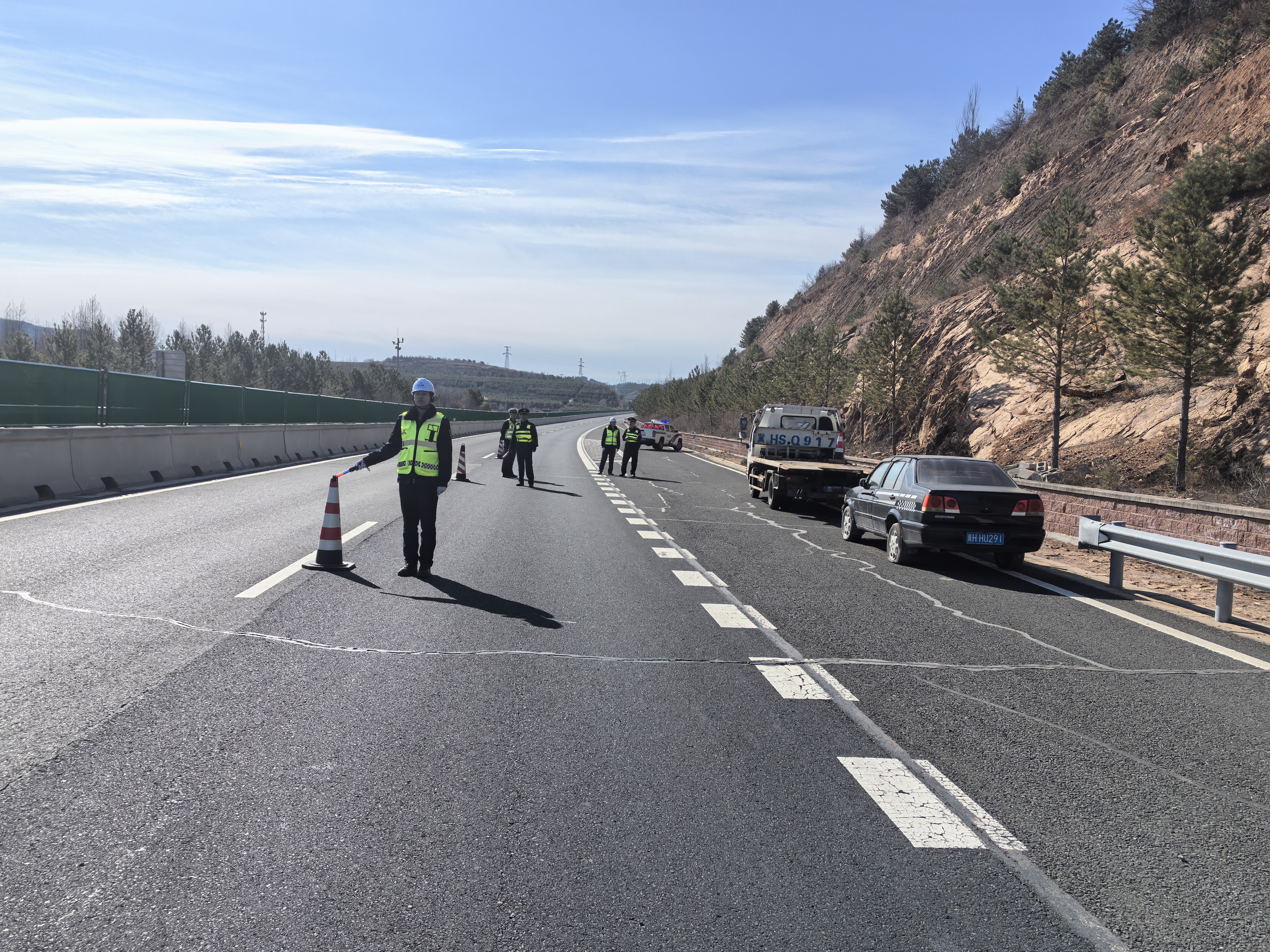 二是实战演练,全面检验救援能力。到达事故现场后,各部门迅速展开行动。高速交警、路政立即对现场路段实施封闭,并疏导过往车辆,有效避免二次事故发生。围场应急大队安排一名工作人员对事故现场进行初步勘探,规划救援流程,精准调配救援资源和专业设备,同时,另外两名工作人员同步对事故现场路损进行勘测。随后,救援单位迅速组织人员及车辆,将事故车拖拽至救援车上运离现场。最后,养护人员对路面油污进行清理,并做好事故现场临时防护工作,直至道路恢复通行条件。