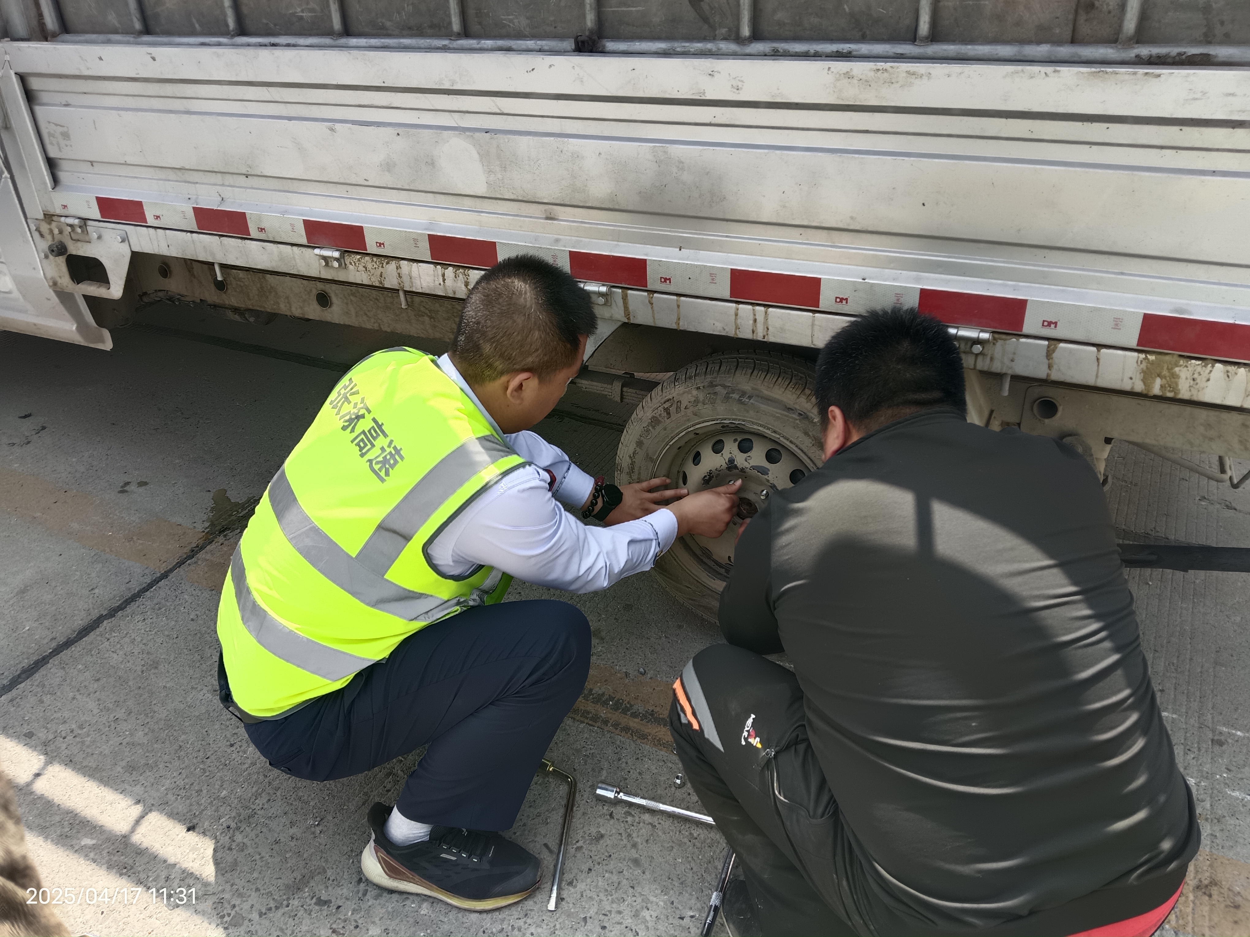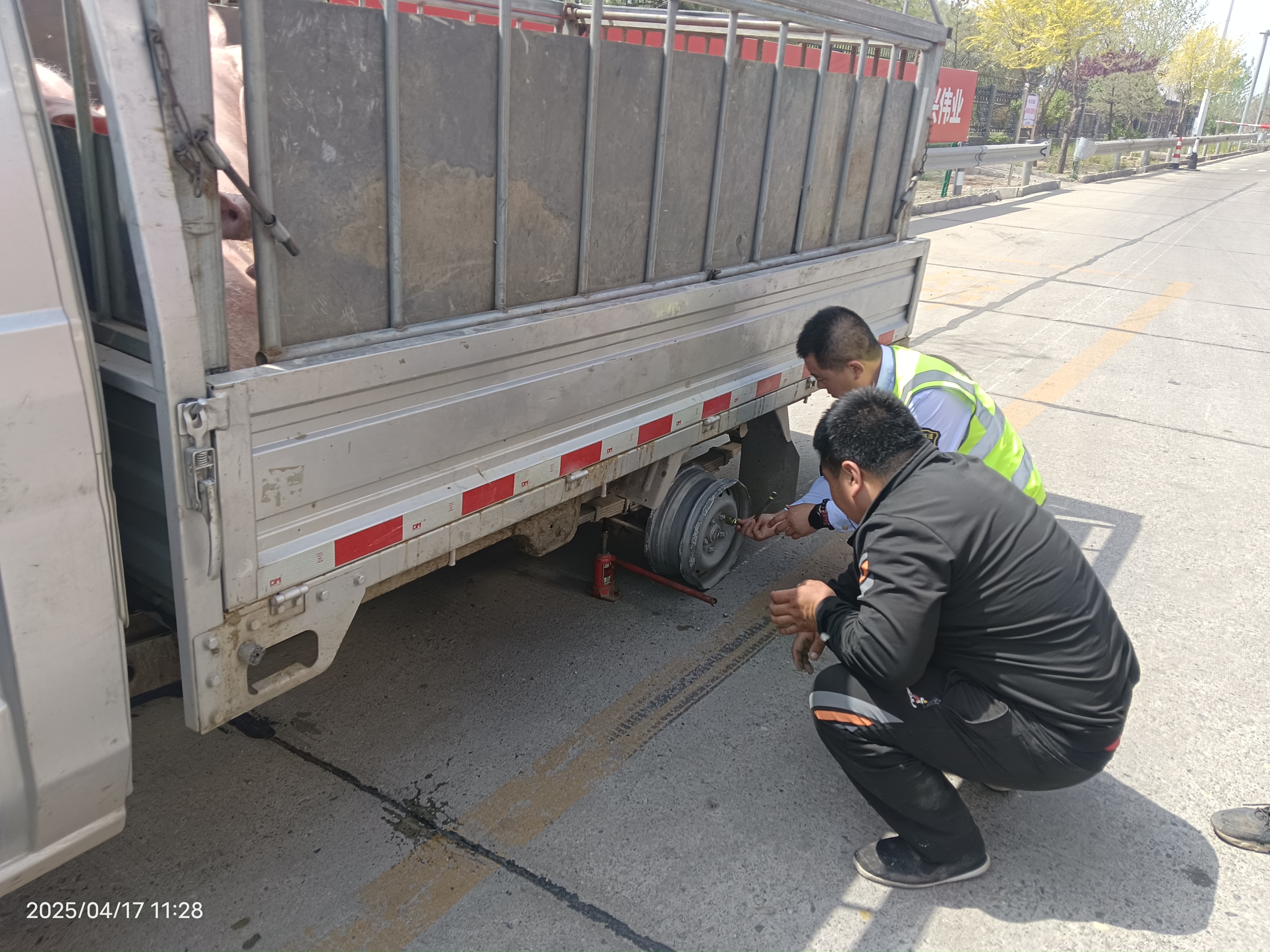 此时,春日的暖阳已带上几分炽热,货车上的猪因为高温和颠簸,发出焦躁的叫声。每一秒的耽搁,都可能让这些鲜活的生命面临危险。收费员尹中彦顾不上擦拭额头的汗水,争分夺秒地投入到换胎工作中。熟练地操作千斤顶,将车身抬起,卸下受损的轮毂,换上备胎。