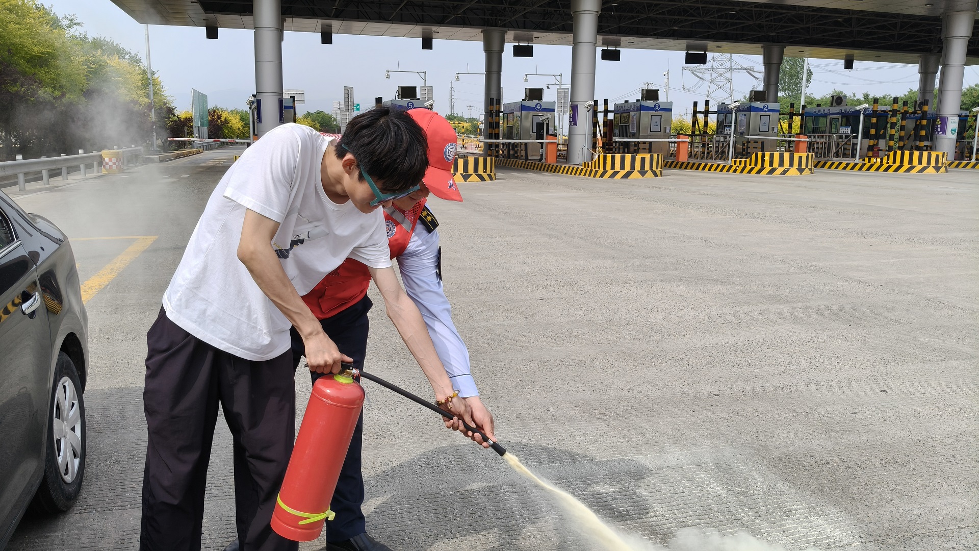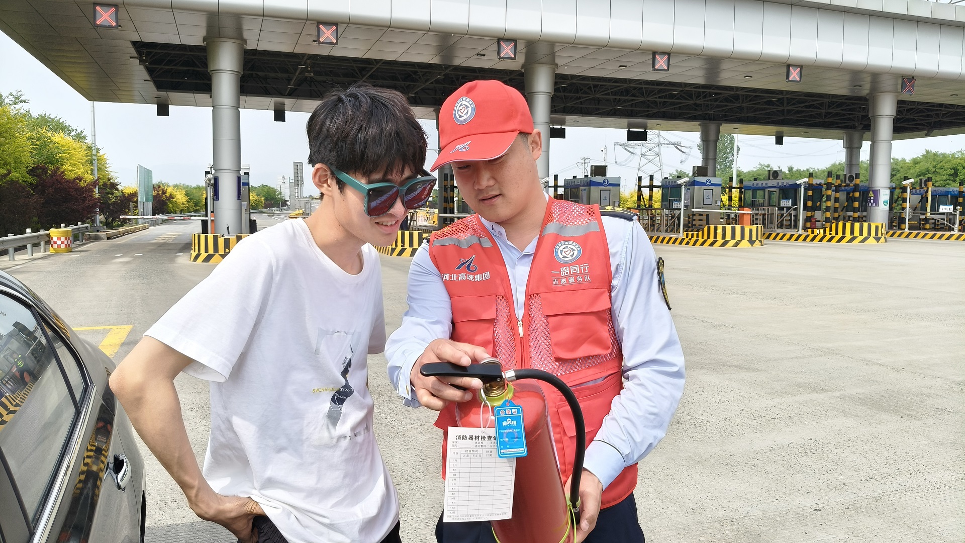 活动现场,玉田城西收费站在出口广场设置了宣传咨询台。志愿者们向过往司乘人员发放了涵盖地震、火灾、暴雨、交通事故等防灾减灾知识宣传页,重点讲解车辆爆胎、刹车失灵、遭遇团雾等常见行车风险的辨识与应急技巧。针对司乘关注的高速公路火灾处置问题,志愿者们通过“理论+实操”方式,邀请司乘现场体验如何正确使用使用灭火器,并强调设置警示标志、人员撤离等关键步骤。