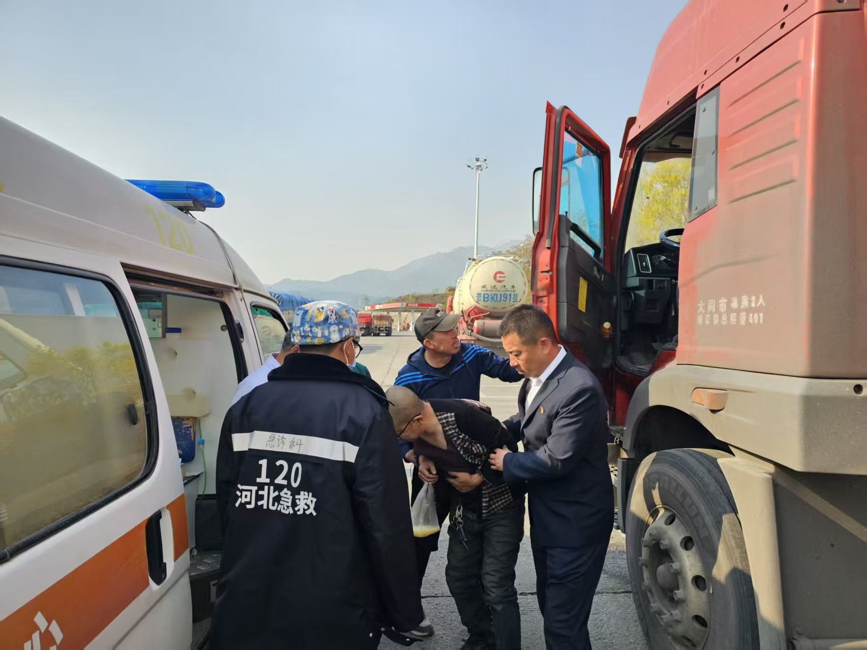 当日6时50分,急促的呼救声划破山区清晨的宁静。值班员接到山西籍司机李先生求助后,驻区经理带领应急小组5分钟内抵达西区现场。发现司机面色惨白、呼吸急促,双手紧捂胸口已无法完整表述症状。面对“时间就是生命”的紧急状况,服务区立即启动三重应急机制:医疗组同步拨打120并连线急救医生远程指导,后勤组疏导车辆预留救援通道,服务组持续安抚患者情绪。
