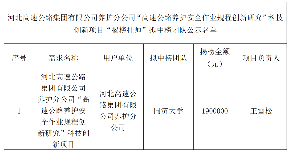 根据集团公司《开云网页版·官方版在线关于修订〈科技创新项目“揭榜挂帅”管理办法〉和印发〈科技创新项目“揭榜挂帅”实施细则(试行)〉的通知》冀高创〔2024〕498号的要求,现将“高速公路养护安全作业规程创新研究”科技创新项目揭榜挂帅拟中榜团队名单进行公示。如有异议,请在公示期内将意见书面反馈至代理机构。